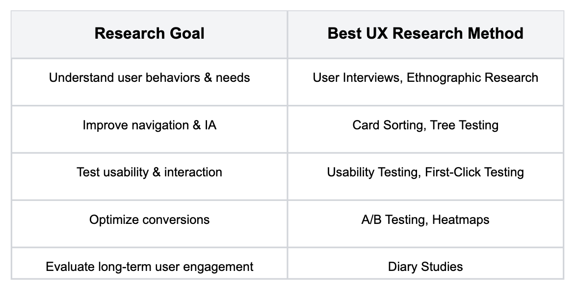 Different UX research methods serve different purposes. The table below helps identify the best method based on the goal of the research.