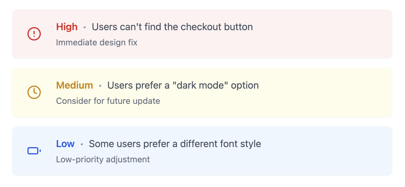 **4. Prioritize findings by impact: **Not all UX research findings hold equal weight. Some insights significantly affect usability and conversion rates, while others are minor inconveniences. Teams need a structured approach to prioritizing issues based on their impact.How to prioritize research findings effectively: